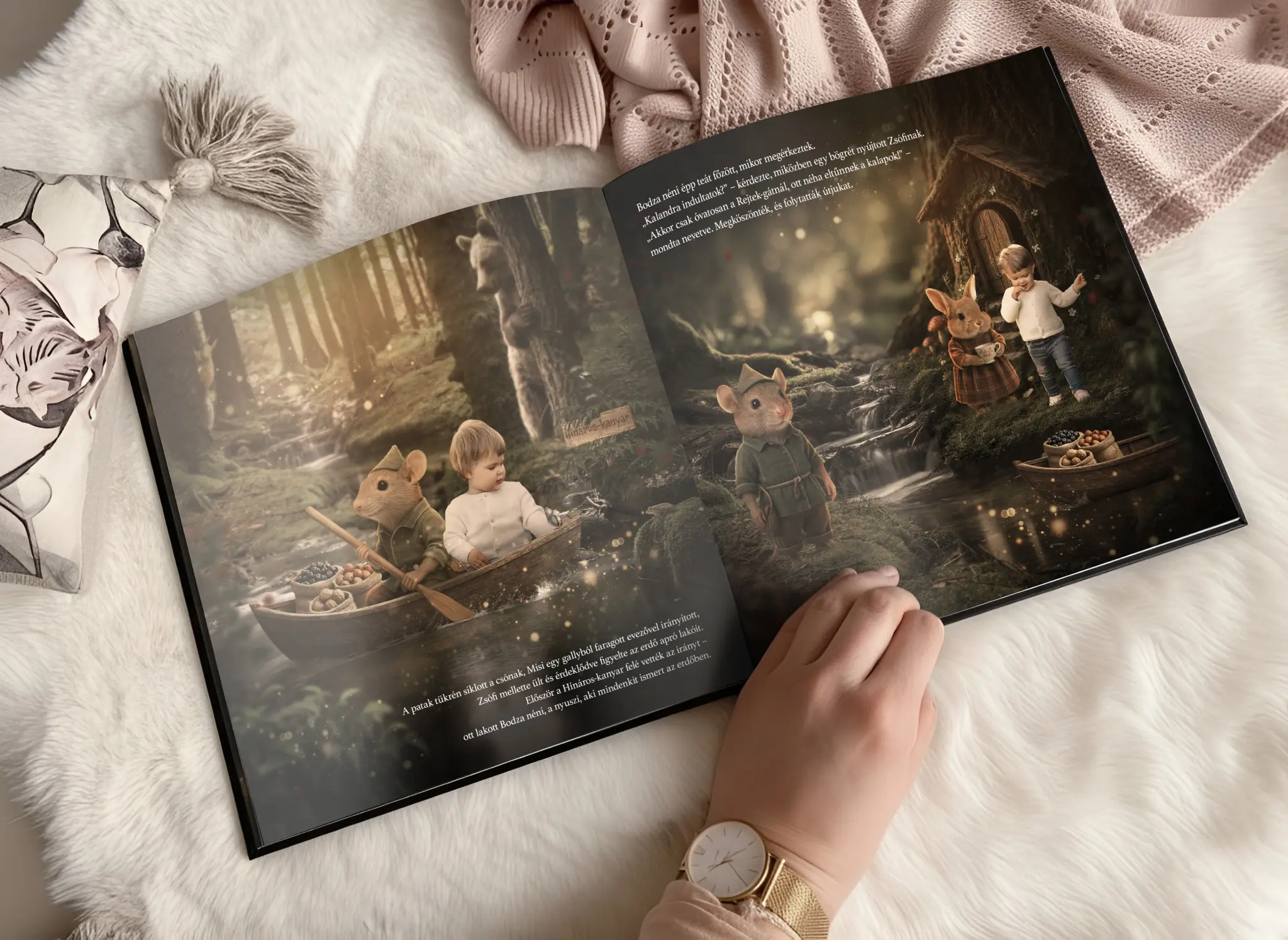 Minden kép kézzel szerkesztve készül: fényekkel, árnyékokkal, apró részletekkel, amelyek életre keltik a mesét. A mesekönyv pedig nem sablon: a Te gyermeked lesz benne a főhős, a saját fotója alapján, egyedi történetekkel, különleges állat karakterekkel és szerethető kalandokkal.